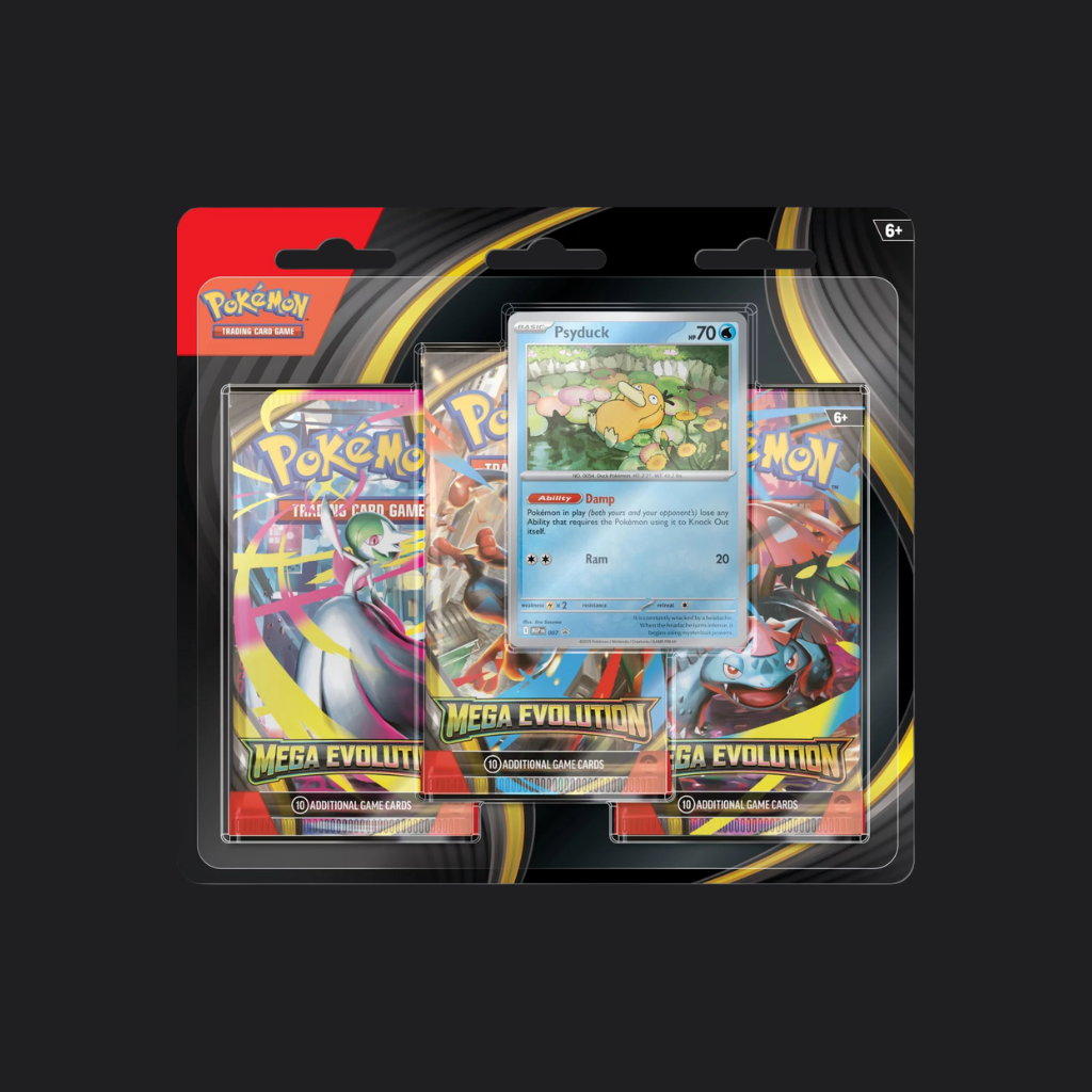 Ein Mega Evolution 3-Pack Blister (englisch) enthält: