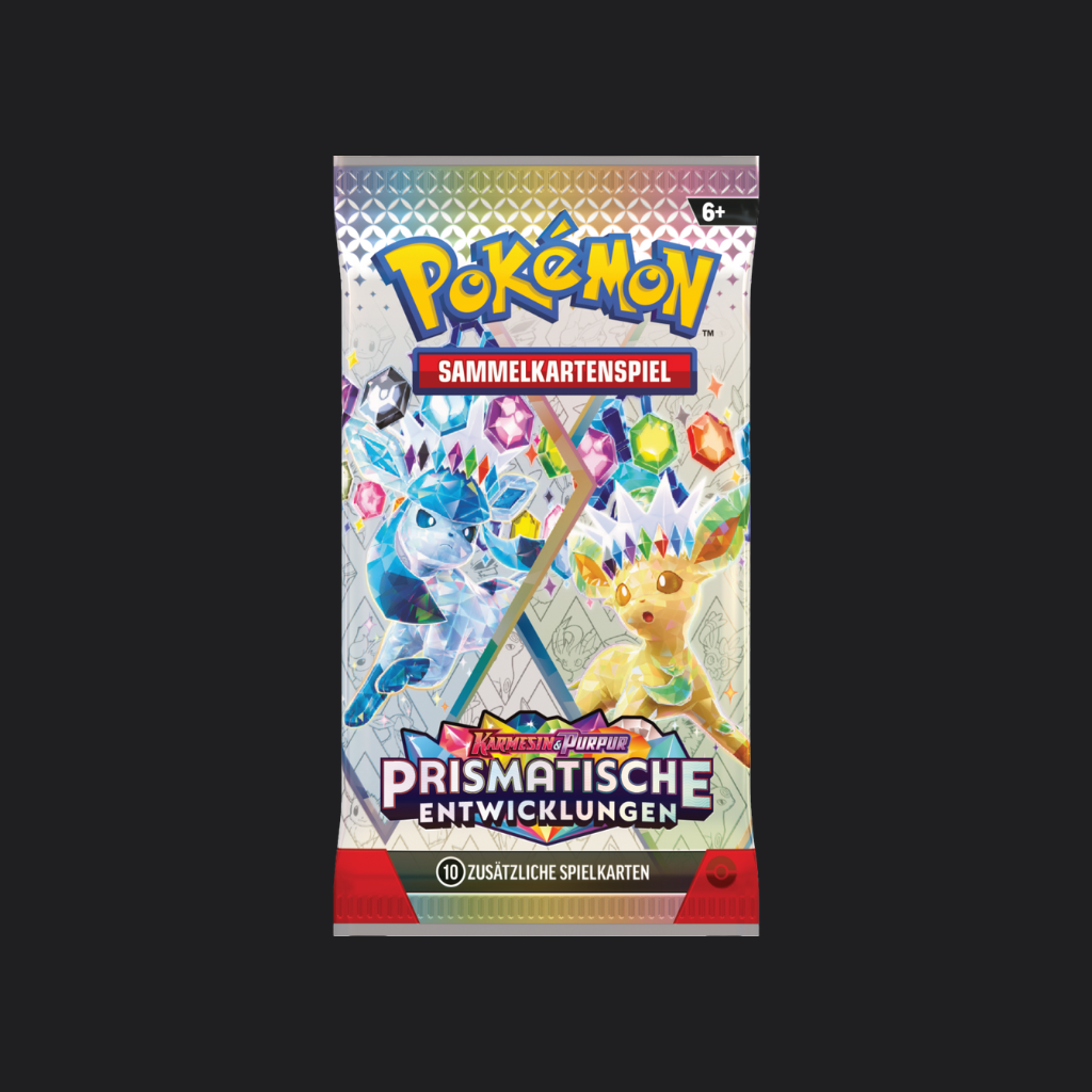 Jedes Boosterpack der Pokémon-Sammelkartenspiel-Erweiterung Karmesin & Purpur - Prismatische Entwicklungen enthält 10 Karten und 1 Basis-Energie.